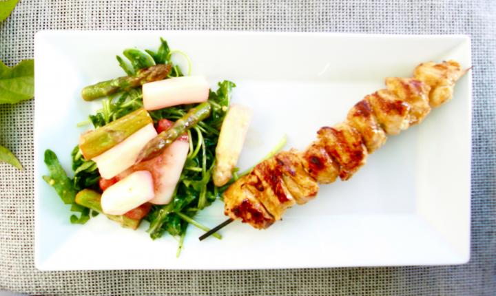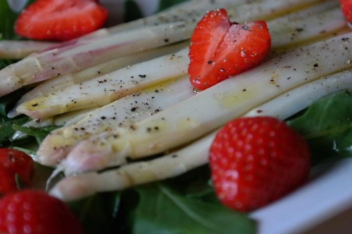 Gestern Abend: Marinierte Hähnchenspieße vom Grill an Spargel-Erdbeer-Rucolasalat. Rez. folgt http://www.eatandmore.eu