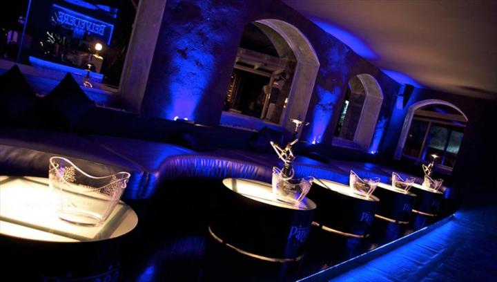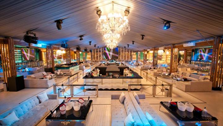 The exquisitely designed nightclub welcomes patrons with an amazing energy and decor, dominated by vibrant colors, like turquoise, white seats, crystal chandeliers and gorgeous lighting, creating a stylish and relaxing summer atmosphere. The stage is located right in the middle of the club and is surrounded by a square -shaped bar, which is the main attraction of the entire location.