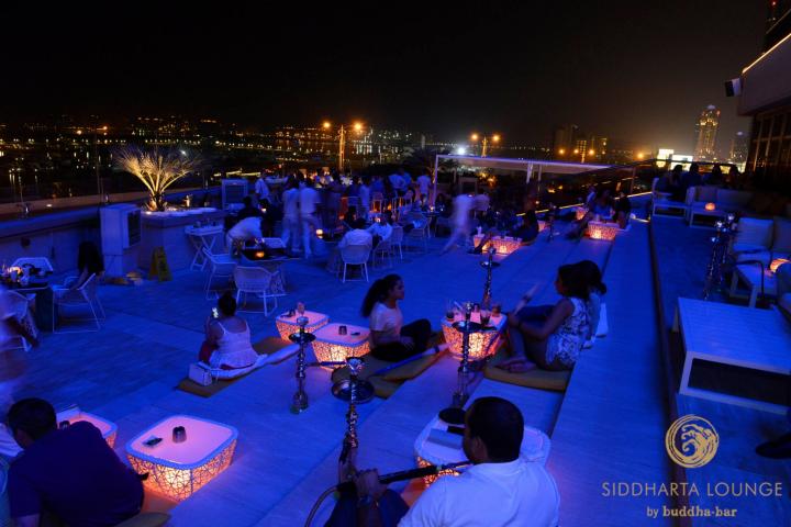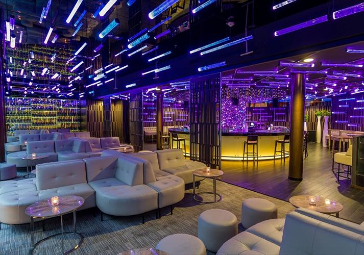 First guests enter the bar and lounge area. Here a big round bar with stylish chrome i...